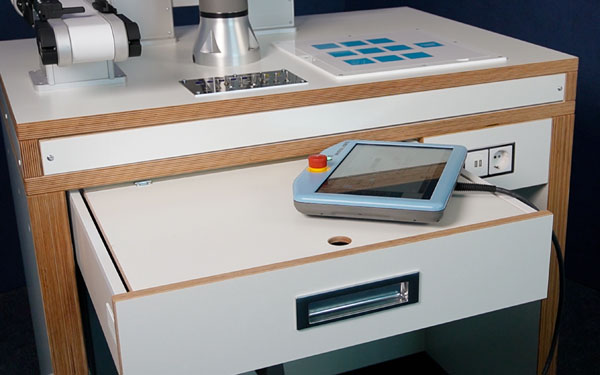 Notre système offre une solution complète comprenant un cobot avec ses accessoires, ainsi qu'un établi optimisé pour cette application, avec alimentation électrique, tous les supports nécessaires pour l'unité de commande, la tablette de programmation et le cobot, et un espace de rangement suffisant pour les accessoires nécessaires.