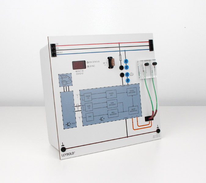 La face avant de l'appareil est imprimée en couleur, ce qui permet une attribution visuelle facile du bus MOST. Pour simplifier le montage expérimental, l'alimentation en tension des bornes 30 et 15, le câble de diagnostic de rupture d'anneau ainsi que la masse sont reliés de gauche à droite à des douilles de sécurité de 4 mm.